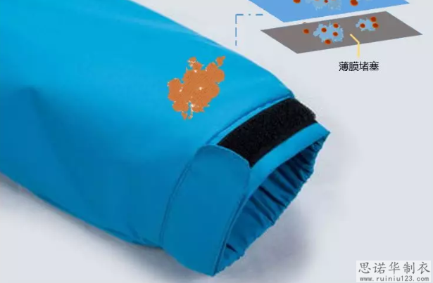 薄膜堵塞:當污垢通過第一層保護層時,很容易開始侵入中間層的薄膜,薄膜被污垢堵塞。 這是整個保護系統的核心區域,夾克的防水透氣功能慢慢丟失!