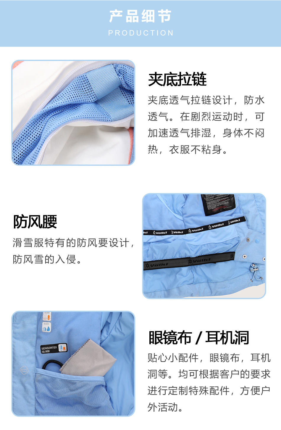 防水拉鏈采用無縫壓膠防水拉鏈激光熱封工藝貼合,面料采用進口防水透氣涂層膜,使防水透氣膜與面料完美結合??筛鶕蛻粜枨笸瓿?a href="http://m.energystar.com.cn/design/" target="_self">戶外沖鋒衣定制。
